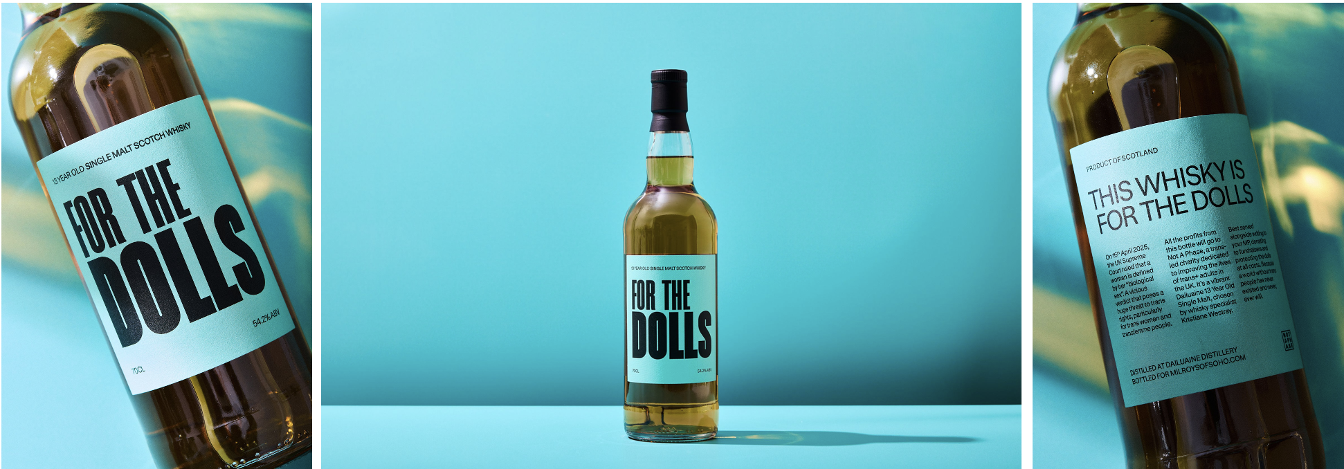 Senior copywriter Rosie Mussen developed the name and the rousing label text, intended as a call to action for cisgender whisky drinkers. The bottle notes that the whisky is “Best served alongside writing to your MP, donating to fundraisers and protecting the dolls at all costs. Because a world without trans people has never existed and never, ever will,” reinforcing the message of solidarity.